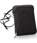 600D polyester. Hideaway adjustable neck cord. Smartphone compatible. Padded main compartment. Passport pocket. Organiser section.